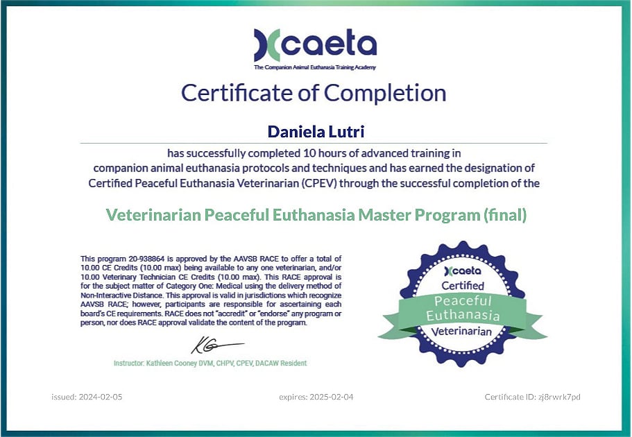 Moreover, Dr. Lutri's CAETA certification signifies her holistic approach to veterinary care, stressing the importance of emotional support for grieving families and fostering community understanding of euthanasia best practices. Her role extends beyond providing medical care, encompassing education and support for her community in making informed end-of-life decisions for their pets. This certification is a testament to Dr. Lutri's dedication to excellence in veterinary medicine and her compassionate care, making her a trusted and invaluable resource for pet owners during their most challenging moments.